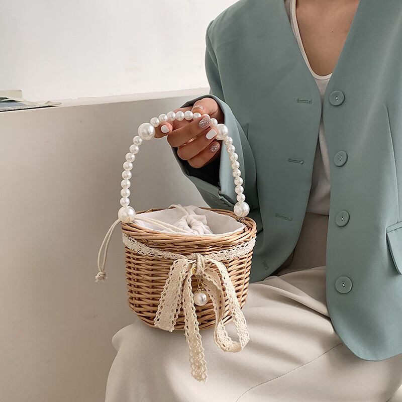 女性の肩のハンドバッグ パールストローバッグ女性ラウンドバレルトート野生のレトロなガス籐ハンドバッグ ストローショルダーバッグ