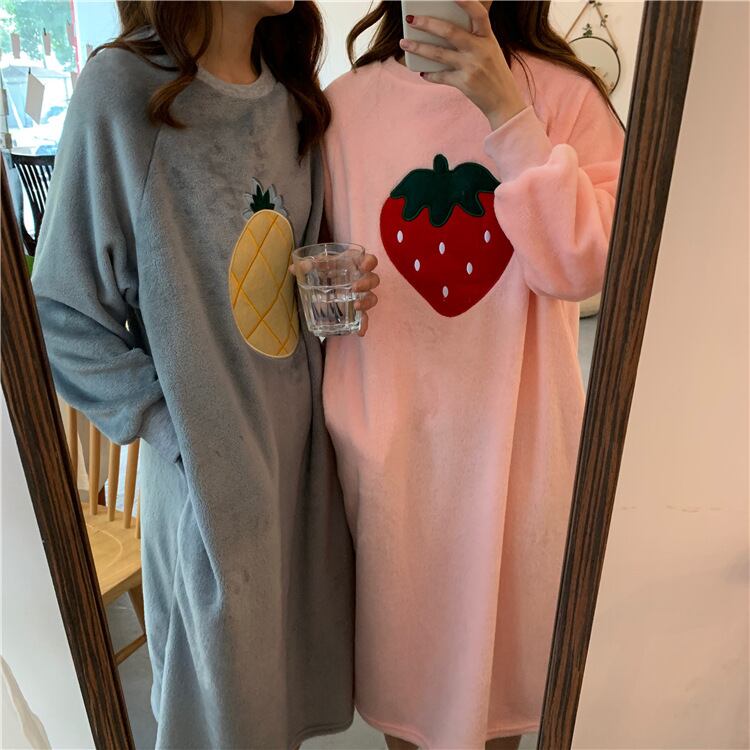 可愛いパジャマ登場 かわいい はながら フランネル刺繍フルーツパターン パジャマ 冬 韓国 ロングセクション 暖かい パジャマ